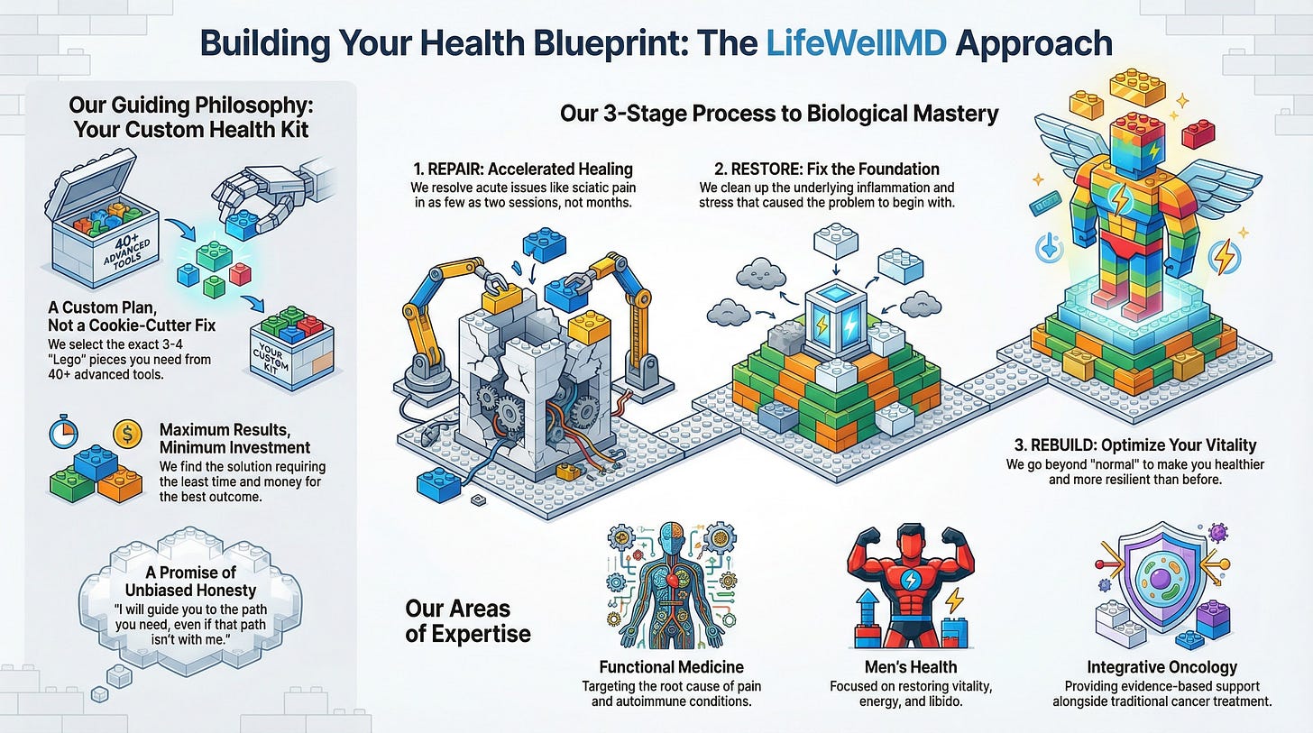 Over the years, I’ve assembled a broad toolkit—peptide therapies, acupuncture, hormone optimization, nutritional interventions, and more. Roughly forty different modalities I can draw from.
